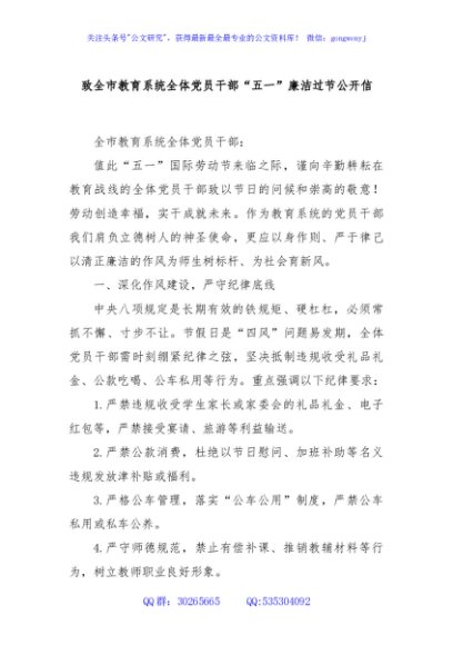 / 致全市教育系统全体党员干部“五一”廉洁过节公开信
