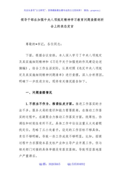 / 领导干部在加强中央八项规定精神学习教育问题查摆剖析会上的表态发言
