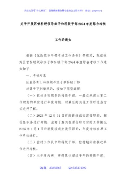 / 关于开展区管科级领导班子和科级干部2024年度综合考核工作的通知