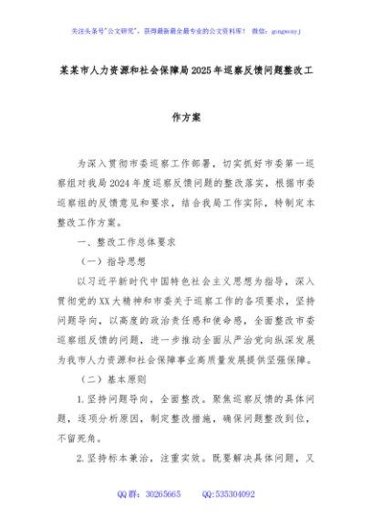 / 某某市人力资源和社会保障局2025年巡察反馈问题整改工作方案