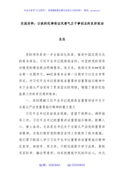 / 交流材料:以铁的纪律保证风清气正干事创业的良好政治生态