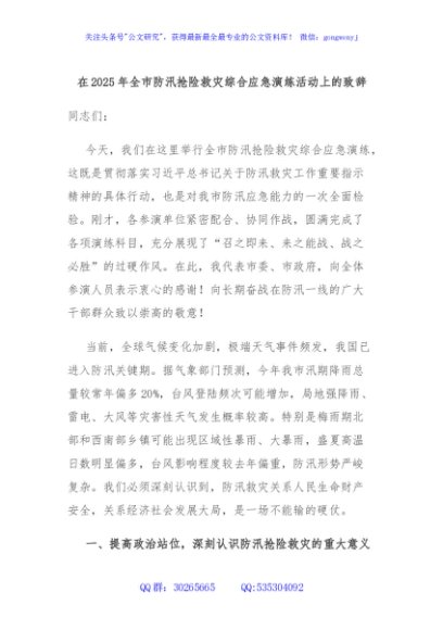 / 在2025年全市防汛抢险救灾综合应急演练活动上的致辞