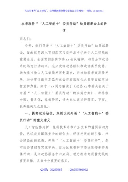 / 在市政协“‘人工智能+’委员行动”动员部署会上的讲话