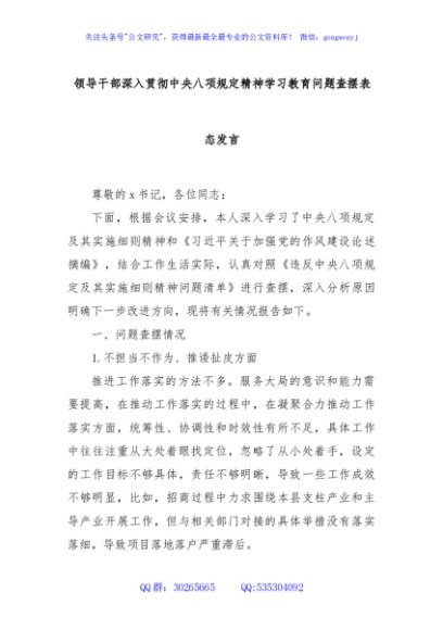 / 领导干部深入贯彻中央八项规定精神学习教育问题查摆表态发言