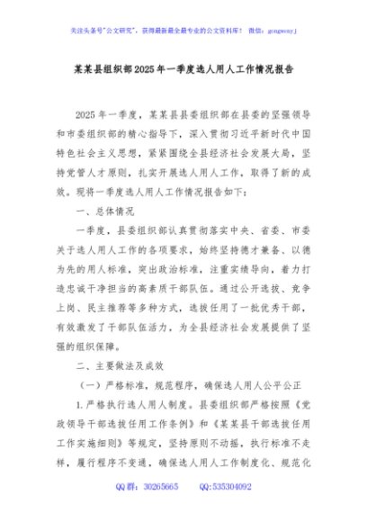/ 某某县组织部2025年一季度选人用人工作情况报告