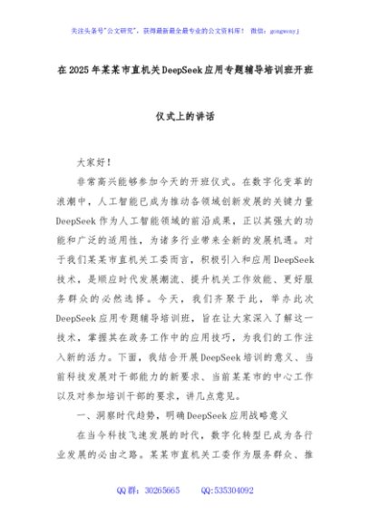 / 在2025年某某市直机关DeepSeek应用专题辅导培训班开班仪式上的讲话