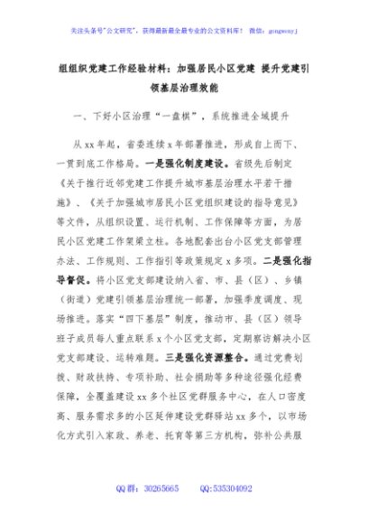 / 组组织党建工作经验材料:加强居民小区党建 提升党建引领基层治理效能