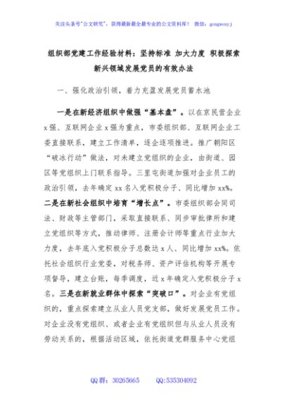 / 组织部党建工作经验材料:坚持标准 加大力度 积极探索新兴领域发展党员的有效办法