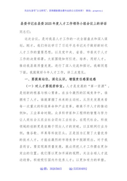 / 县委书记在县委2025年度人才工作领导小组会议上的讲话