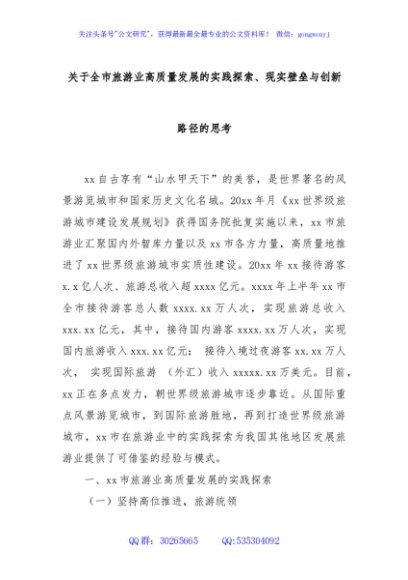/ 关于全市旅游业高质量发展的实践探索、现实壁垒与创新路径的思考