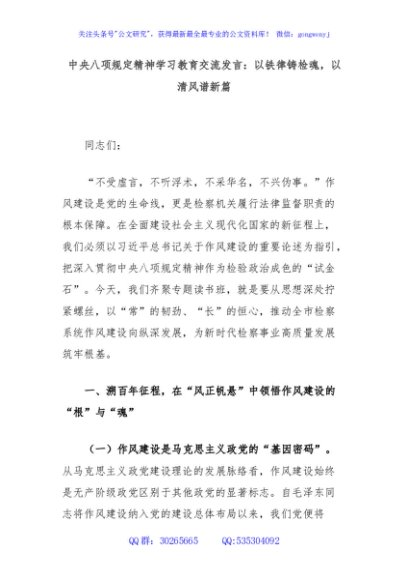 / 中央八项规定精神学习教育交流发言:以铁律铸检魂,以清风谱新篇