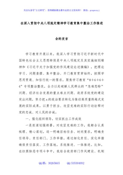 / 在深入贯彻中央八项规定精神学习教育集中整治工作推进会的发言