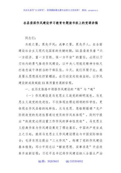 / 在县委深作风建设学习教育专题读书班上的党课讲稿