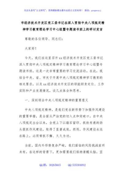 / 市经济技术开发区党工委书记在深入贯彻中央八项规定精神学习教育理论学习中心组暨专题读书班上的研讨发言