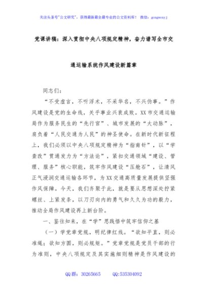 / 党课讲稿:深入贯彻中央八项规定精神,奋力谱写全市交通运输系统作风建设新篇章