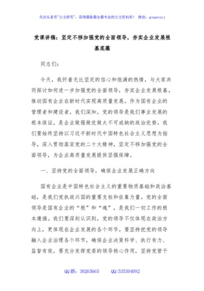/ 党课讲稿:坚定不移加强党的全面领导,夯实企业发展根基底蕴
