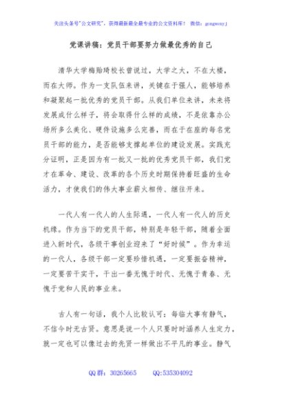 / 党课讲稿:党员干部要努力做最优秀的自己