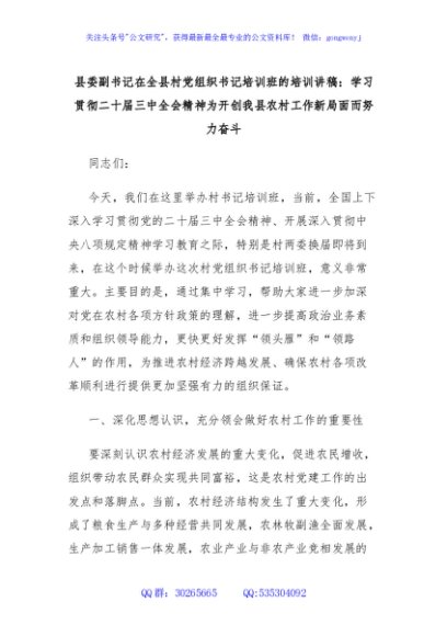 / 县委副书记在全县村党组织书记培训班的培训讲稿:学习贯彻二十届三中全会精神为开创我县农村工作新局面而努力奋斗