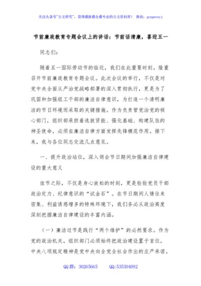 / 节前廉政教育专题会议上的讲话:节前话清廉,喜迎五一