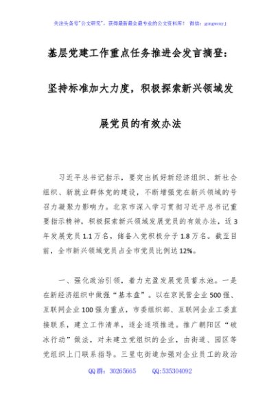 / 基层党建工作重点任务推进会发言摘登:坚持标准加大力度,积极探索新兴领域发展党员的有效办法
