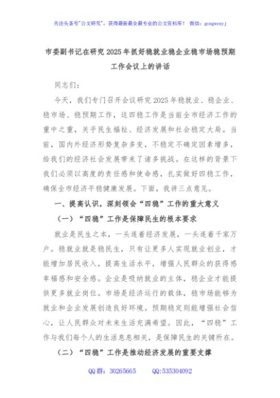 / 市委副书记在研究2025年抓好稳就业稳企业稳市场稳预期工作会议上的讲话
