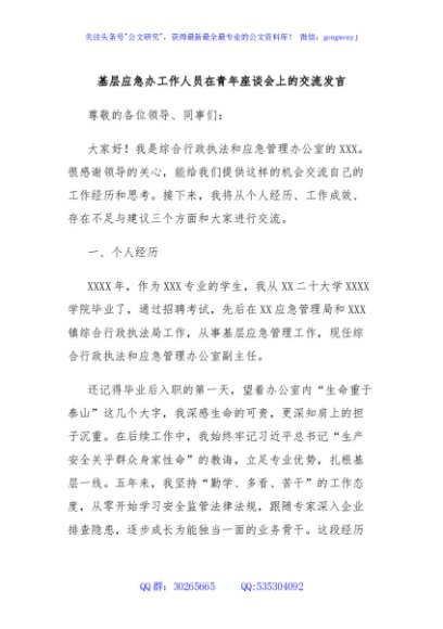 / 基层应急办工作人员在青年座谈会上的交流发言