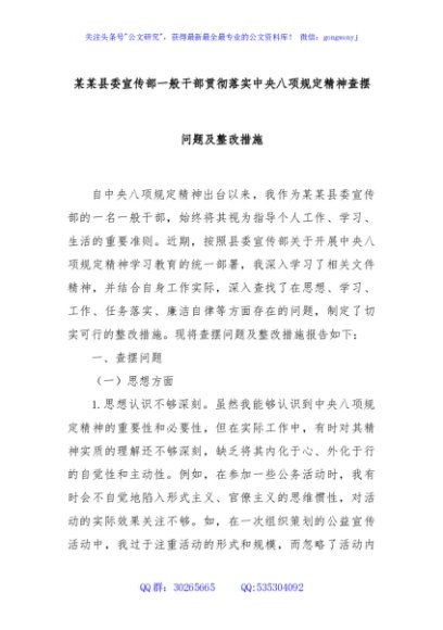 / 某某县委宣传部一般干部贯彻落实中央八项规定精神查摆问题及整改措施