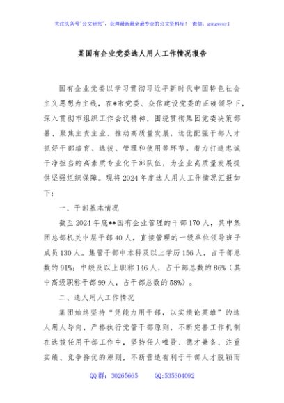 / 某国有企业党委选人用人工作情况报告