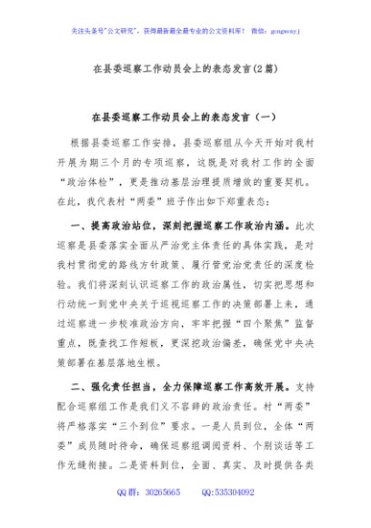 / (2篇)在县委巡察工作动员会上的表态发言