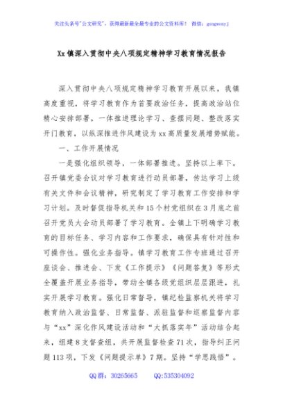 / Xx镇深入贯彻中央八项规定精神学习教育情况报告