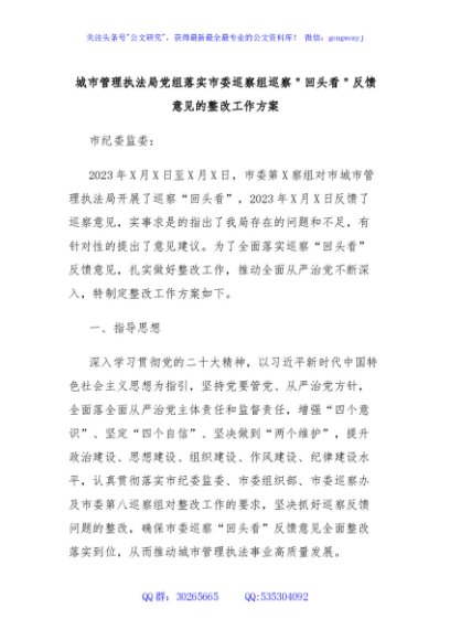 / 城市管理执法局党组落实市委巡察组巡察"回头看"反馈意见的整改工作方案