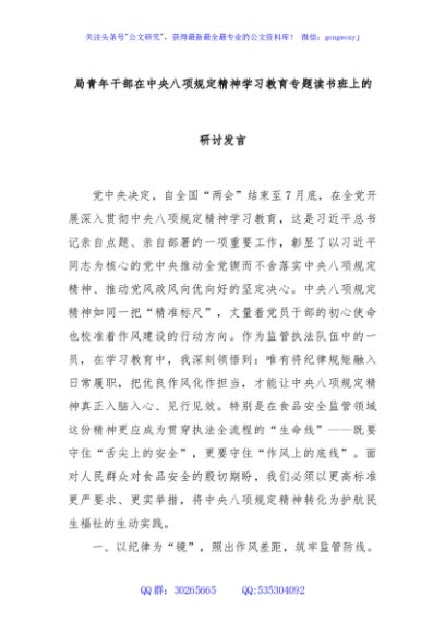 / 局青年干部在中央八项规定精神学习教育专题读书班上的研讨发言