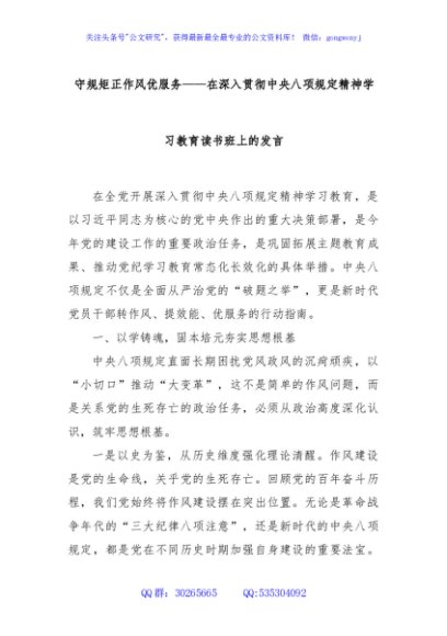 / 守规矩正作风优服务——在深入贯彻中央八项规定精神学习教育读书班上的发言