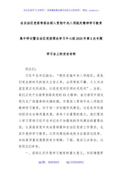在自治区党委常委会深入贯彻中央八项规定精神学习教育集中研讨暨自治区党委理论学习中心组2025年第2次专题学习会上的发言材料