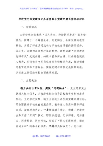 / 学校党支部党建和业务深度融合党建品牌工作经验材料