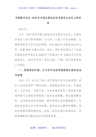 / 市委副书记在 2025年市委全面依法治市委员会会议上的讲话