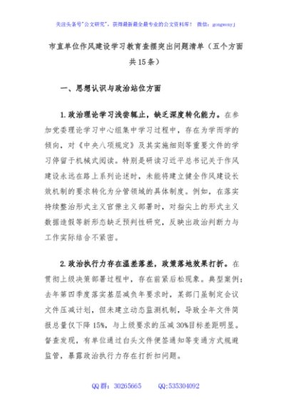 / 市直单位作风建设学习教育查摆突出问题清单(五个方面共15条)
