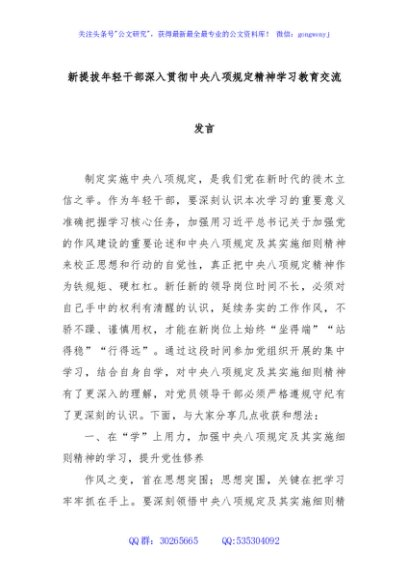 / 新提拔年轻干部深入贯彻中央八项规定精神学习教育交流发言