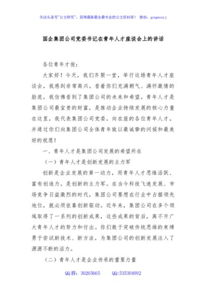 / 国企集团公司党委书记在青年人才座谈会上的讲话