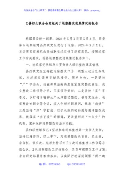 / X县妇女联合会党组关于巡察整改进展情况的报告