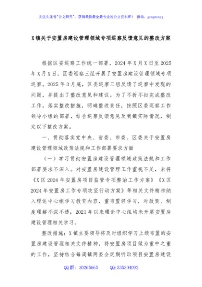 / X镇关于安置房建设管理领域专项巡察反馈意见的整改方案