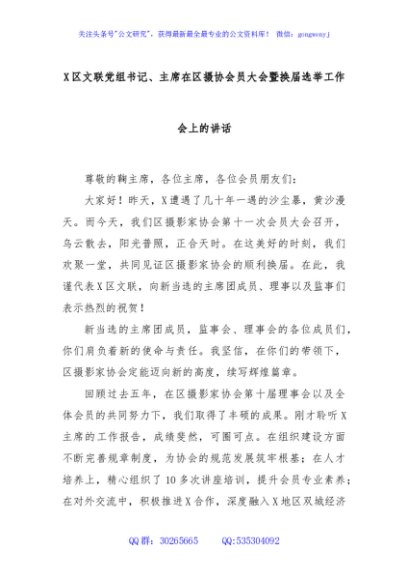 / X区文联党组书记、主席在区摄协会员大会暨换届选举工作会上的讲话