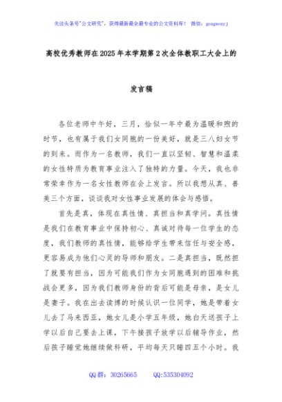 / 高校优秀教师在2025年本学期第2次全体教职工大会上的发言稿