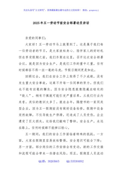 / 2025年五一劳动节前安全部署动员讲话