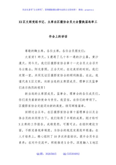 / XX区文联党组书记、主席在区摄协会员大会暨换届选举工作会上的讲话