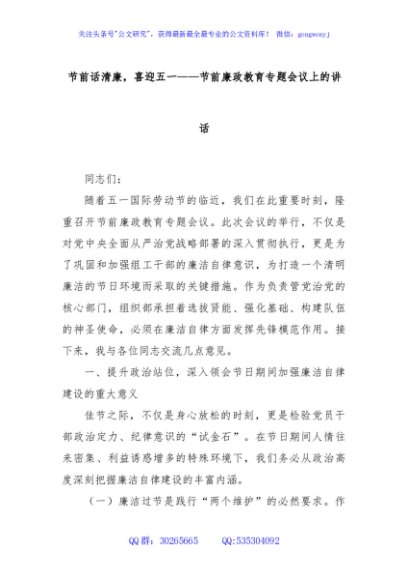 / 节前话清廉,喜迎五一——节前廉政教育专题会议上的讲话