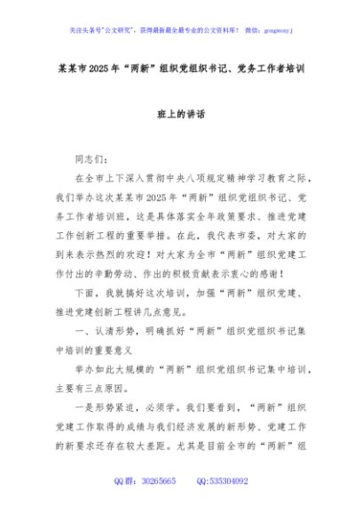 / 某某市2025年“两新”组织党组织书记、党务工作者培训班上的讲话