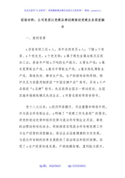 / 经验材料:公司党委以党建品牌创建推动党建业务深度融合