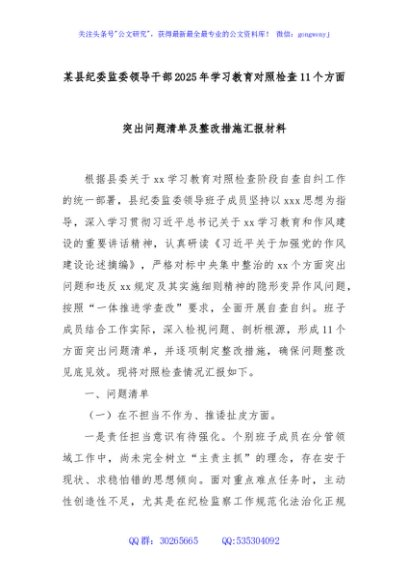 / 某县纪委监委领导干部2025年学习教育对照检查11个方面突出问题清单及整改措施汇报材料