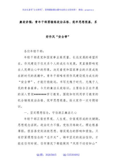 / 廉政讲稿:青年干部要锤炼政治品格、筑牢思想根基,系好作风“安全带”